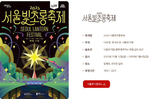 청계천으로 이동하면 '서울빛초롱축제'가 기다려요. 12월 13일~2026년 1월 12일까지 (우이천 연장 포함) 이어지며, 올해 테마는 "My Light, Our Dream, the Magic of Seoul"이에요. 청계천 1.2km 구간에 240여 개의 LED 랜턴이 설치돼 밤하늘처럼 빛나요. 전통 한지 랜턴과 현대 미디어 아트가 섞여 로맨틱함이 배가 되죠.