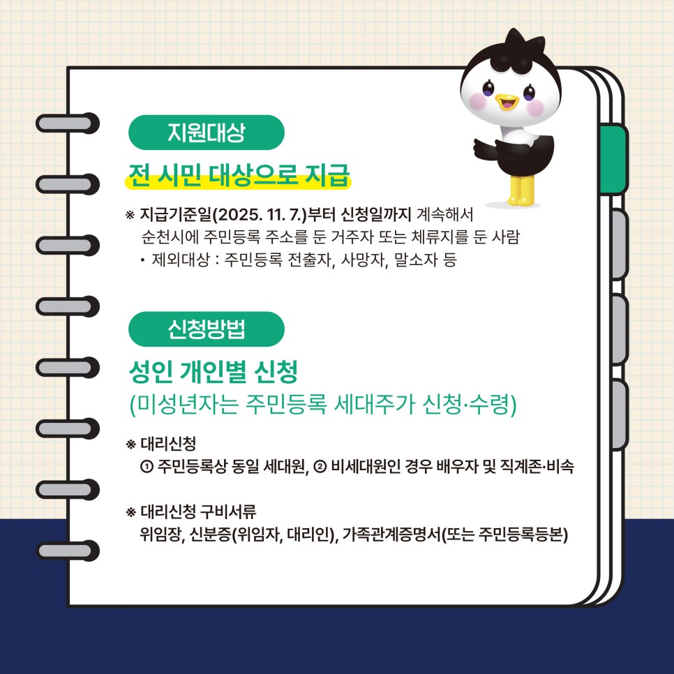 - 기준: 2025년 11월 7일부터 신청일까지 순천시에 주민등록이 유지된 시민. (이사 온 지 얼마 안 됐어도 OK, 하지만 기준일 이전 이사 온 분은 미포함)